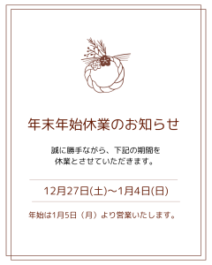 NEWS 2025.12.16 お知らせ 年末年始休業のお知らせ 誠に勝手ながら下記の日程で 年末年始休業とさせていただきます 12/27(土)~1/4(日) 1/5(月)から通常営業を開始します 休業期間中にいただいたお問い合わせへのご返信は1/5より順次行ってまいります みなさまにはご迷惑をお掛けしますが どうぞよろしくお願いいたします